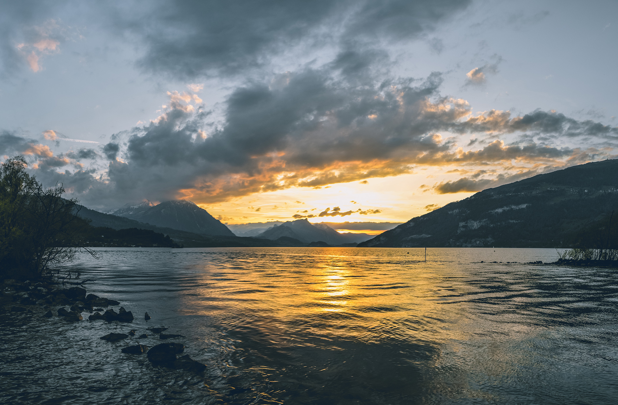 After lunch, we went to go find chocolate. We got a cappuccino torte, which was delicious from the Grand Restaurant SchuhI. We found this lake called Lake Thun on google maps and we wanted to go there. We took this random road down to the Lake. There were lots of cute feral cats wandering around. We went during sunset, so it was very buggy though. We got to this pier and watched the sunset and then headed back to the hotel before it got too dark.
